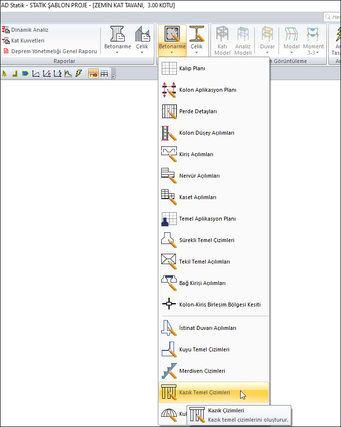 Ribbon menü betonarme sekmesi Çizim oluştur başlığı altından ulaşabilirsiniz.