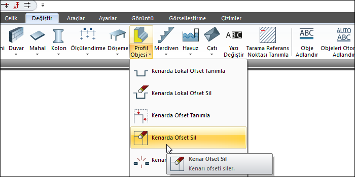Profil objesinde kenarda ofset tanımla komutu ile yapılan öteleme işlemini iptal edecektir.