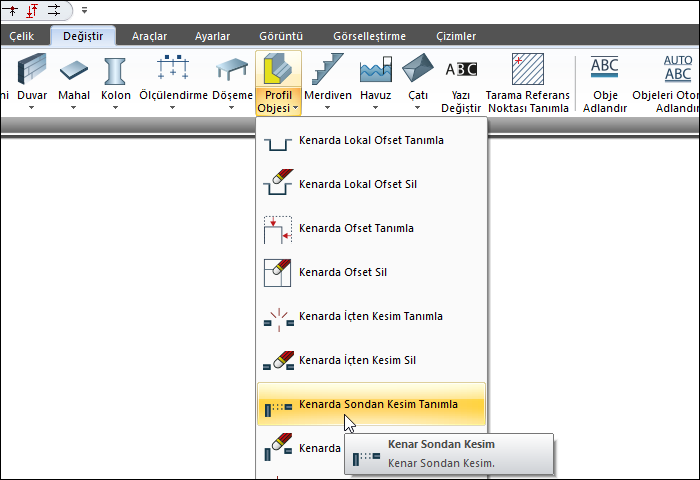 Kenarda Sondan Kesim Tanımla komutu profil objesinin başında veya sonunda, belirli bir mesafede boşluk açar. Objeyi kısaltır.