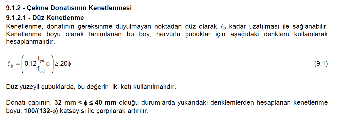 Kolona birleşen kirişlerin kolonun diğer yüzünde devam etmediği durumlarda kirişlerdeki alt ve üst donatı, kolonun etriyelerle sarılmış çekirdeğinin karşı taraftaki yüzeyine kadar uzatılıp etriyelerin iç tarafından 90 derece bükülecektir. Bu durumda boyuna donatının kolon içinde kalan yatay kısmı ile 90 derece kıvrılan düşey kısmının toplam uzunluğu, TS 500’de öngörülen düz kenetlenme boyu lb ’den az olmayacaktır. 90 derecelik kancanın yatay kısmı 0.4lb ’den, düşey kısmı ise 12φ ’den az olmayacaktır Perdelerde ve a ölçüsünün düz kenetlenme boyu lb ’den ve 50φ ’den daha fazla olan kolonlarda, boyuna donatının kenetlenmesi, 90 derecelik kanca yapılmaksızın düz olarak sağlanabilir.