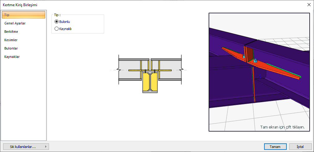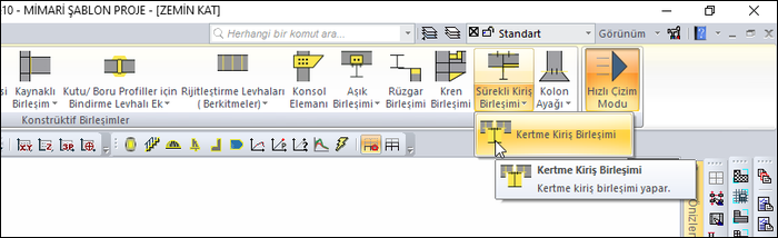 Birleşim sekmesinden Kertme Kiriş Birleşimi satırını tıklayın.
