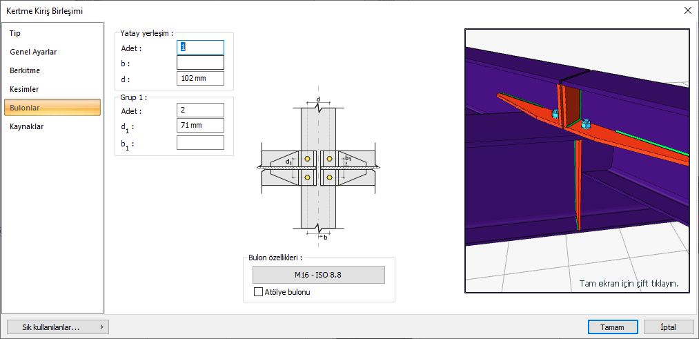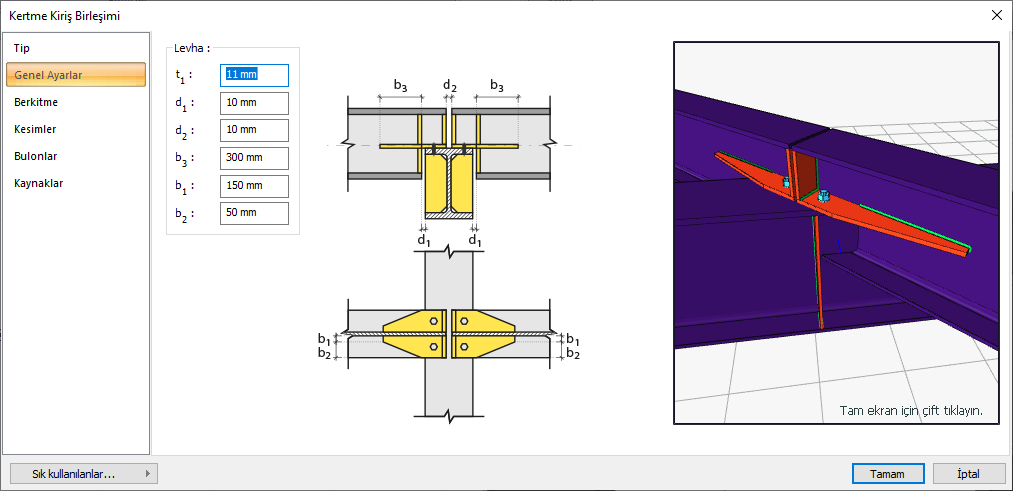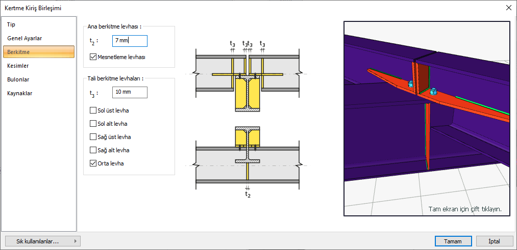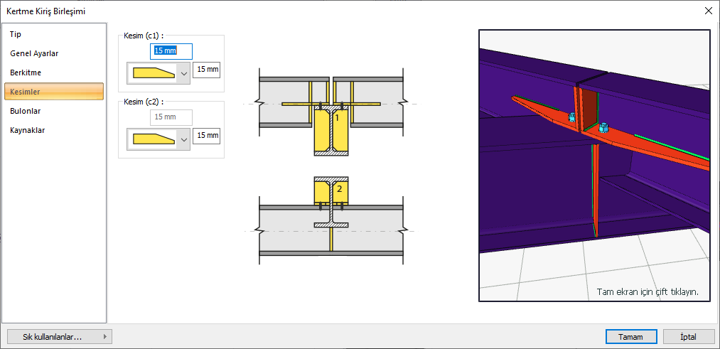 Kertme Kiriş Birleşimi Ayarları Diyaloğu