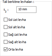 Tali berkitme levhaları ![]() Tali berkitme levhaları değerler girilerek belirlenir. Girilecek değerler şematik çizimde gösterilmektedir. |