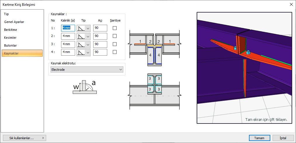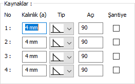 Kaynaklar ![]() Birleşim yerlerine yapılacak kaynakların kalınlık, tip ve açı değerleri verilir. Şantiyede yapılıp yapılmayacağı bilgisi girilir. |