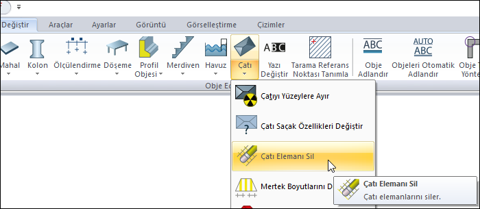 Ribbon menüde değiştir sekmesi Obje Edit başlığında yer alan Çatı Elemanı Sil ikonunu tıklayın.