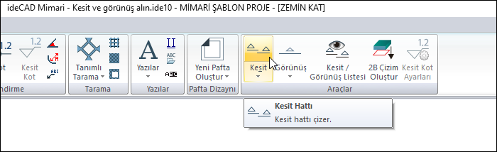 Kesit komutu ile yapı içinden geçirilen hatta göre otomatik kesit çizimleri oluşturulur. Çizilen hattın yerine göre düzlem içinde kalan tüm objeler kesilen, düzlemin önünde bulunan diğer objeler ise görünen objeler olarak değerlendirilir. ideCAD kesit ve görünüşü otomatik olarak ayırır, ancak kesit alınmak isteniyorsa kesit, görünüş alınmak isteniyorsa görünüş hattı çizilmelidir.