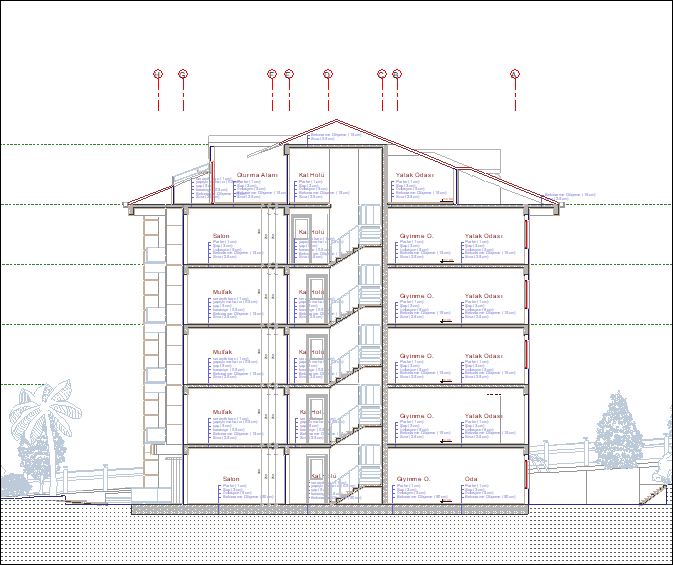 Kesit pencerelerinde projede oluşturulmuş kesitler görüntülenir. Kesit hattı üzerindeki objeler kesilen, bakış doğrultusundaki diğer objeler ise görünendir. Kesit oluşturularak kat planlarında çizilen 3 boyutlu objeler paralel projeksiyonlar 2 boyutlu çizgilere ve taramalara dönüştürülür. Çizilen kesit hattı kadar kesit penceresi oluşturulabilir.