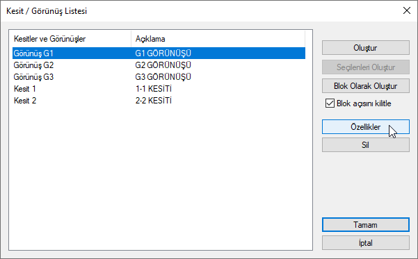 Ayrıca kesit/görünüş listesinden özellikler butonuna tıklayarak, listeden seçili kesit/görünüş hattının ayarlarına ulaşabilirsiniz.