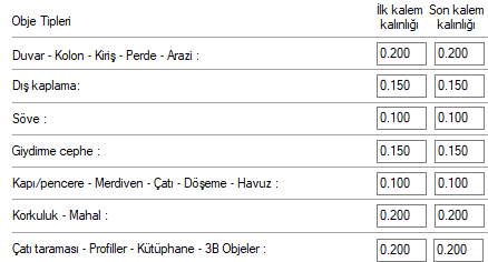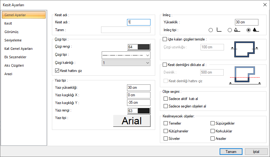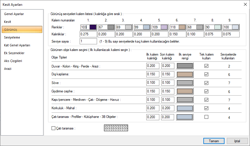 Kesilen obje renk ve tarama ayarları ![]() Kesilen objelerin renkleri, tarama şekilleri ve kalem kalınlığı değerleri ayarlanır. Kesilen objeler, beton, duvar, kapı/pencere, kaplama, çatı, temel, arazi, havuz ve diğer olmak üzere farklı obje tiplerine ayrılmış olup, her tip için kalınlık, renk ve tarama tipi düzenlemesi yapılabilir. |