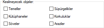 Kesilmeyecek objeler ![]() Temeller, kütüphaneler, söveler, süpürgelikler, korkuluklar ve araziler objelerinden işaretlenenler kesilmezler. |