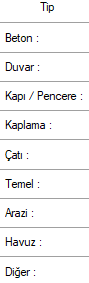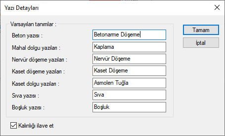 Yazı detayları ![]() Malzeme listesinin düzenlendiği bölümdür. Buton tıklandığında Yazı Detayları adıyla bir diyalog açılır. Diyalogda beton, mahal dolgusu, nervür ve kaset döşeme, sıva, boşluklar için yazı girilebilir. Girilen yazılar kesitte ilgili eleman için oklar çıkarılarak gösterilir. ![]() Kalınlığı ilave et: Kesit yazısını yanında eleman kalınlıkları da otomatik ilave edilir (Sıva 2.5 cm gibi). |