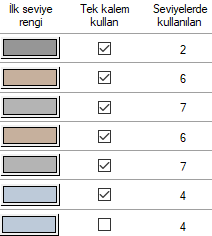 Tek kalem kullan ve ilk seviye rengi ![]() Bu seçenek işaretli ise ilgili obje tipi için kullanılacak kalem kalınlığı, ilk seviye renginde verilen rengin kalem kalınlığı ile aynı olur. Seçenek işaretli değilse, ilk seviye rengi kutucuğunda seçilen rengin kalınlığı baz alınarak, seviye sayısı satırında verilen kalem sayısı kadar kalem kalınlık aralığı dikkate alınır. Örneğin Söve için, ilk seviye rengi 1.kalem numarasında seçilen renk ile aynı verilmiş olunsun. Seviye sayısı da örneğin 3 olsun. Tek kalem kullan seçeneği işaretli ise söve kalem kalınlığı, 1.kalem için verilen kalınlık değeri kadar alınacaktır. Tek kalem işaretli değilse, sırayla 1., 2. ve 3, kalem numaraları için verilen kalem kalınlık değerleri kullanılacaktır. Seviyelerde kullanılacak kalem kalınlıkları Seviyelerde kullanılan sütununda ayrıca gösterilmektedir. |