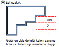 Eşit uzaklık ![]() Görünen objenin derinliği, görünüş sekmesinde verilen kalem sayına bölünür, renk ve kalem kalınlıkları görünüşte eşit aralıklarda değişir. |