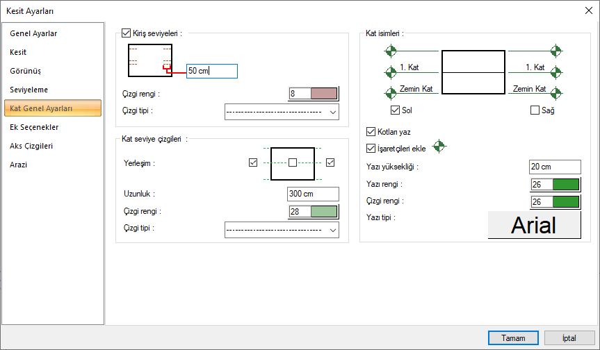 Kat isimleri yerleşimi - Sol/Sağ ![]() Kesit veya görünüş düzleminin solunda ve/veya sağında kat isimlerini yazar. |