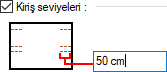Kiriş seviyeleri ![]() Kesit ve görünüşte kiriş izlerinin gösterilip gösterilmeyeceğini belirleyen seçenektir. Seçenek işaretlenirse kirişler verilen uzunluk değeri göre görünüşte gösterilir. |