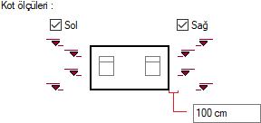 Kot ölçüleri yerleşimi - Sol/Sağ ![]() Kesit veya görünüş düzleminin solunda ve/veya sağında kot ölçülerini yazar. Girilen uzaklık değerine göre kot ölçüleri oluşturulur. |