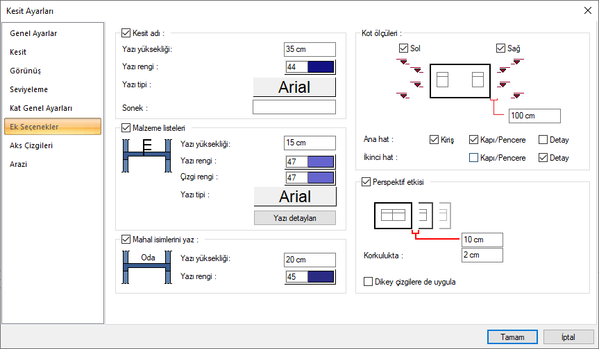 Kesit Hattı Ayarları/Görünüş Ayarları komutları ile kesit/görünüş çizimlerine ait parametrelere ve seçeneklere ulaşılır. Projeye göre kesit/görünüş ayarları yapılır.