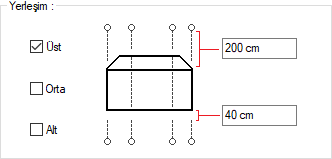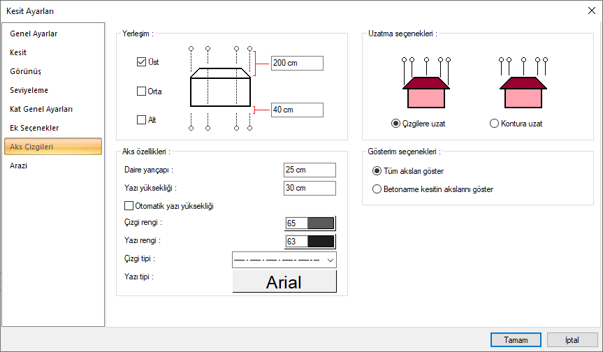 Yerleşim ![]() Kesit/görünüş düzleminde bulunan aksların çizimin nerelerinde gösterileceği üst, çizim boyunca ve alt seçeneklerinden istenilenler işaretlenerek belirlenir. Aksların çizimden uzaklığı ve aks uzunlukları için değerler şematik çizimde yer alan kutucuklara girilir. |