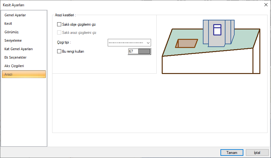 Kesit ve görünüşte, arazi objesinin kesit çizgilerine ilişkin, arazi arkasında kalan çizgilerin görünür veya saklanır olma özellerini ve çizgi tiplerini belirleyen sekmedir. Şekle bakarak seçenekleri belirleyin.
