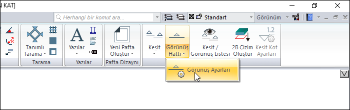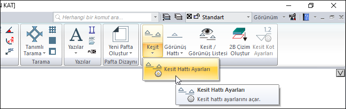 Ribbon menü Çizimler sekmesi Araçlar başlığından Kesit Hattı Ayarlarına ve Görünüş Ayarlarına ulaşabilirsiniz.
