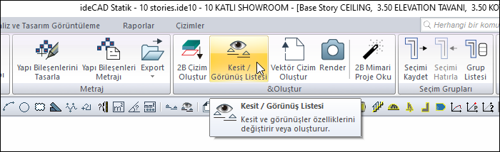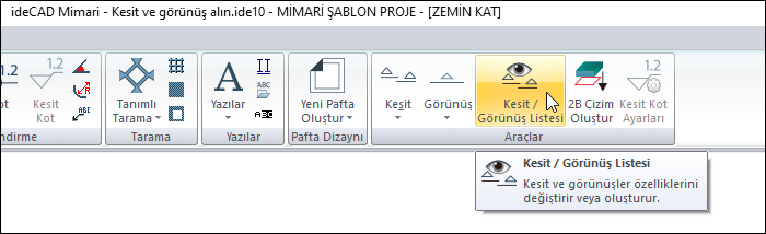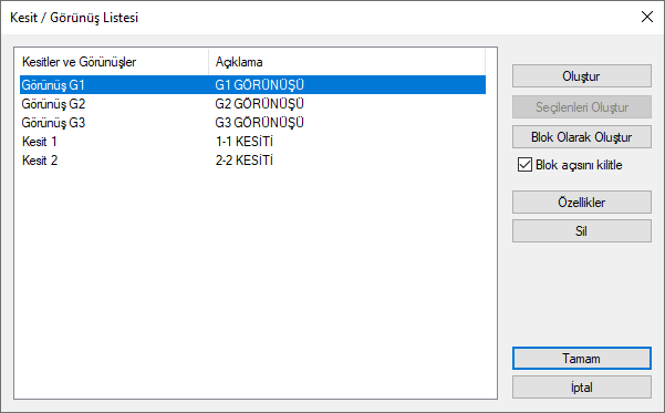 Kesit/görünüş listesi komutu ile projede bulunan kesit ve görünüş hatlarını listelenir. Diyalogda listelenen hatların özellikleri ayarlanabilir, silinebilir veya kesit/görünüş oluşturma işlemi ile kesit/görünüş çizimleri oluşturulabilir.