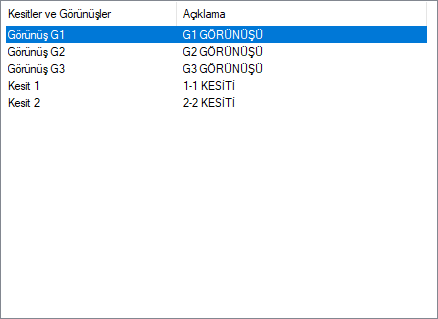 Kesit/Görünüş listesi ![]() Kesit ve görünüş hatları listelenir. |