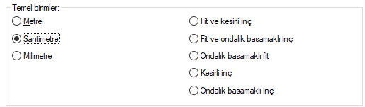 Temel birimler ![]() Seçimlerden biri farenin sol tuşu işe tıklanarak etkin hale getirilir. Metre: İşaretlenirse, bilgi yazısının birimi metre olur. |