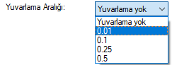 Yuvarlama aralığı ![]() Metre, santimetre ya da milimetre olarak yapılacak ölçülendirmenin yuvarlama aralığını belirler. Yuvarlama yok seçilirse, ölçülendirme tam değerinde yapılır. Aralık büyüdükçe ölçülendirme seçilen aralık kadar yuvarlanır. |