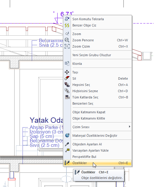 Ayarlarına girmek istediğiniz kesit kot ölçülendirmeyi seçin farenin sağ tuşuna tıklayarak açılan menüden Özellikler satırına tıklayın.