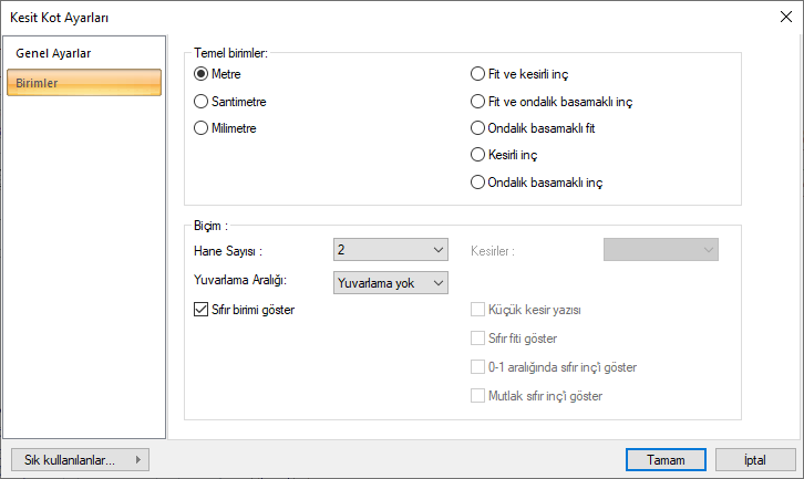 Kesit Kot Ayarları - Birimler Sekmesi