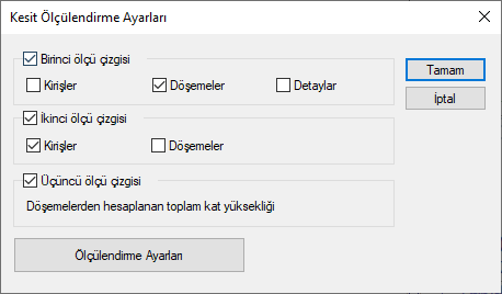 Kesit ölçülendirme grubu komutları ile kiriş, döşeme ölçülendirmeleri yapılır. Kesit pencerelerinde aktif hale gelir. 3 tane ölçü çizgisi oluşur. Ayarlardan ölçü çizgi sayısı ve üzerinde verilecek bilgiler değiştirilir.