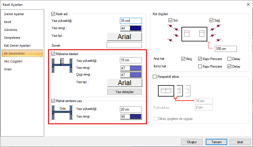 Malzeme listeleri ve Mahal isimlerini yaz özellikleri ile kesitlerde çizilen elemanlara ait malzemeler ve kesitin geçtiği mahallere ait bilgiler, kesitte isteğe bağlı olarak gösterilir.