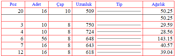 Donatı tablosu oluştur ![]() İşaretlenirse, donatılar tiplere ayrılır ve adedi, çapı, boyu, tipi ve ağırlıklarını belirten bir tablo oluşturularak donatı metrajı çizimde gösterilir. ![]() |