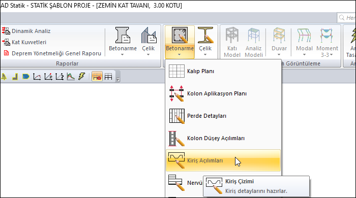 Ribbon menü betonarme sekmesi Çizim oluştur başlığı altından ulaşabilirsiniz.