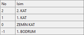 No ve İsim ![]() Kat numaraları ve isimleri listelenir |