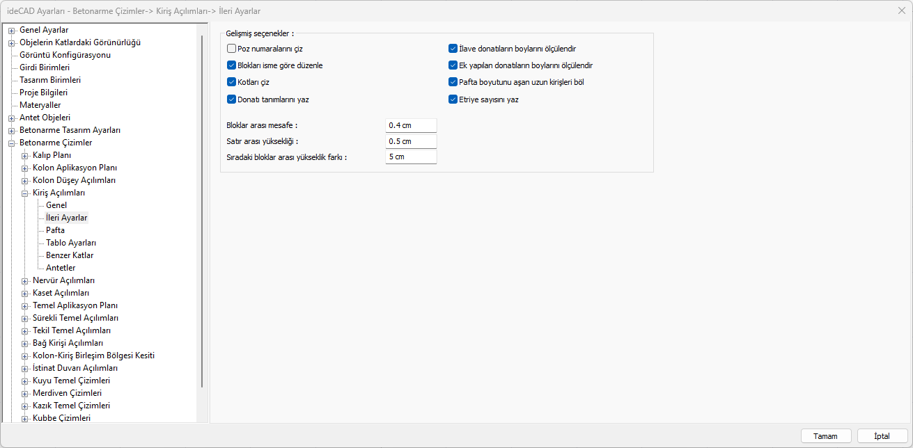 Bloklar arası mesafe ![]() Bloklar arası minimum yatay mesafe girilir. Blok, donatılarıyla, kesitleriyle ve ölçülendirmesiyle her bir açılımın kendisidir. |