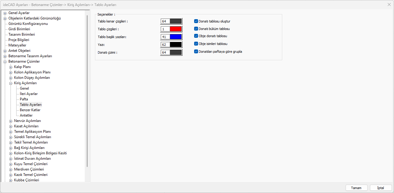 Obje donatı tablosu ![]() İşaretlenirse, obje donatı tablosu oluşturularak çizimde gösterilir. |