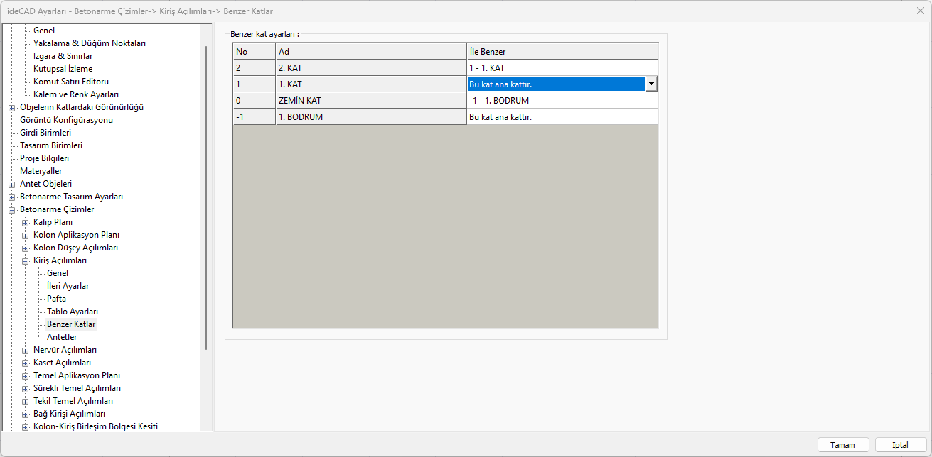 Benzer kat kiriş açılımları düzenlenirken seçilen ana katın en gayri müsait olanı seçilmelidir. Aksi takdirde ana katta olmayıp üst katlarda mevcut olan donatılar çizimlerde görünmeyecektir. Betonarme diyalogları veya raporlardan kiriş donatıları kontrol edilerek ana kat belirlenmelidir.