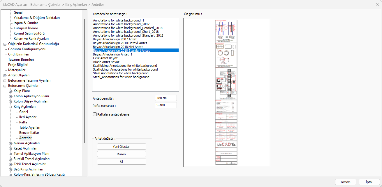 Kiriş açılımlarına ait yazıların renk, büyüklük ve tip, pafta, tablo ve antet ayarları, benzer kat ayarları düzenlenir.