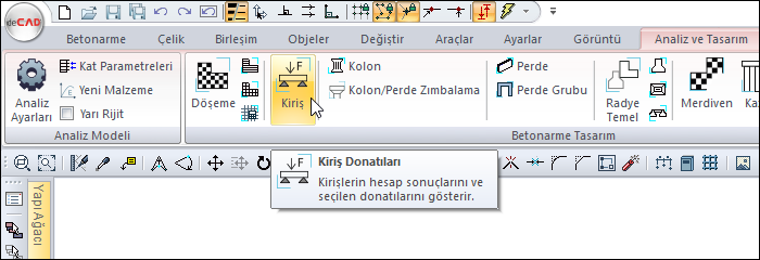 Analiz+tasarım 'dan sonra, ribbon menü Analiz ve Tasarım sekmesi Betonarme Tasarım başlığı altından Kiriş Donatıları komutuna tıklayarak ulaşabilirsiniz.