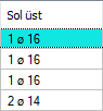 Sol üst ![]() Kirişin sol mesnet kesitinin üstünde bulunan ilave (ek) donatının adet ve çap cinsinden değeridir. Hücreyi çift tıklayarak değişiklik yapabilirsiniz. |