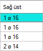 Sağ üst ![]() Kirişin sağ mesnet kesitinin üstünde bulunan ilave (ek) donatının adet ve çap cinsinden değeridir. Hücreyi çift tıklayarak değişiklik yapabilirsiniz. |