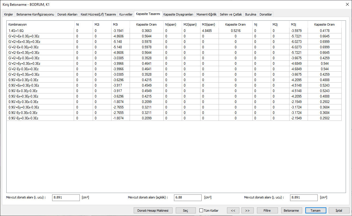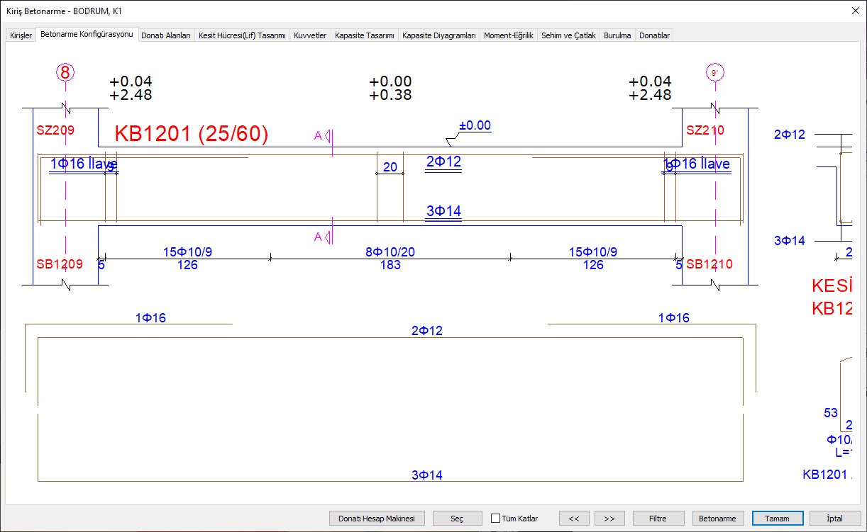 Kiriş betonarme tasarım sonuçları ve kirişlere ilişkin yetersizlik durumları Kiriş Betonarme diyaloğunda gösterilir. Kiriş betonarme diyaloğunda, kiriş enine ve boyuna donatıları (açıklık ve mesnet donatıları), analiz sonucunda hesaplanan iç kuvvetler, TBDY 'e ilişkin artırılmış iç kuvvetler, kapasite oranları, sehim ve çatlak kontrolü sonuçları verilir. Kiriş donatıları Kiriş Betonarme diyaloğunda değiştirilir ve sabitlenir.