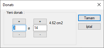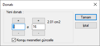 Aynı işlem çizim üstünde bulunan herhangi bir donatı yazısı değeri üstünde tıklanarak da yapılabilir. Bu durumda sadece tıklanan donatının değiştirileceği diyalog açılır.