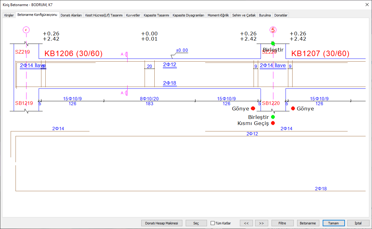 Birleştir: Kiriş sürekli ise, sürekli kirişler otomatik olarak aynı süreklilikte olurlar ve donatı maksimum donatı uzunluk değeri(12 metre) kadar sürekli çizilir. Dolayısıyla bu seçenek otomatik olarak yeşildir. Eğer seçenek iptal edilirse (kırmızı yapılırsa), iptal edilen kiriş sürekli çizilmez, ortak mesnette komşu kirişten kopartılır.