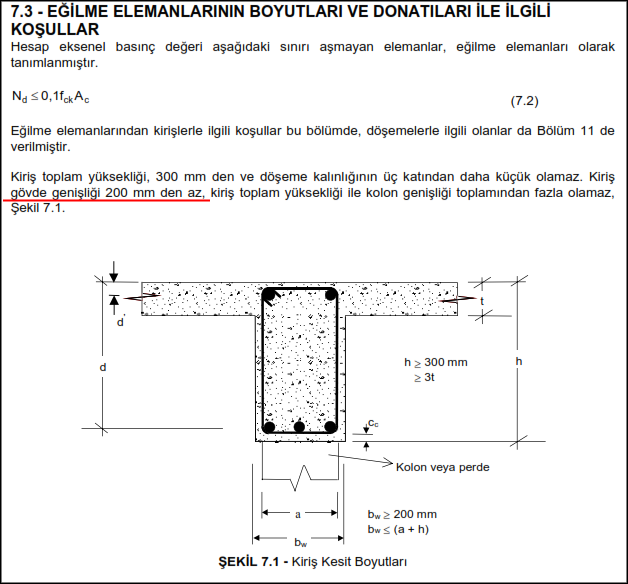 Kiriş genişliği, 200mm'den az olamaz. (T.S.500 7.3)