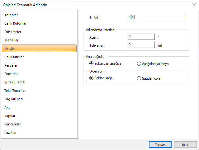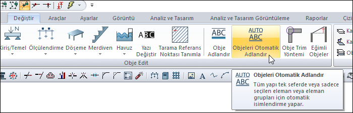 Objeleri otomatik adlandır komutunu kullanarak kiriş numaralarını değiştirebilirsiniz. Otomatik adlandırma ile tüm yapıyı tek seferde veya sadece seçilen elemanı veya eleman gruplarını adlandırabilirsiniz.