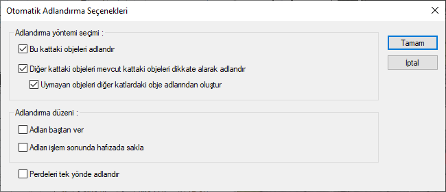Otomatik adlandırmayı yaparken kat bazında ”Diğer kattaki objeleri mevcut kattaki objeleri dikkate alarak adlandır” seçeneğini işaretlenirse diğer katlarda bulunan elemanlar, çalışılan kattaki elemanlar ile aynı olacak şekilde adlandırılır. İşaretlenmezse her katın elemanları kendi katın içindeki duruma göre adlandırılır.