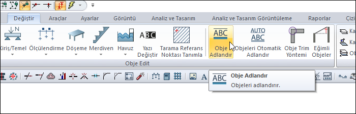 Bir başka seçenek ise kat bazında tek tek kendinizde adlandırma yapabilirsiniz. İlk başta seçeceğiniz elemana göre ismi girip, sırasıyla elemanları seçerseniz o sıralamada adlandırma yapmış olursunuz. Bu işlem için Obje adlandır komutunu kullanabilirsiniz.