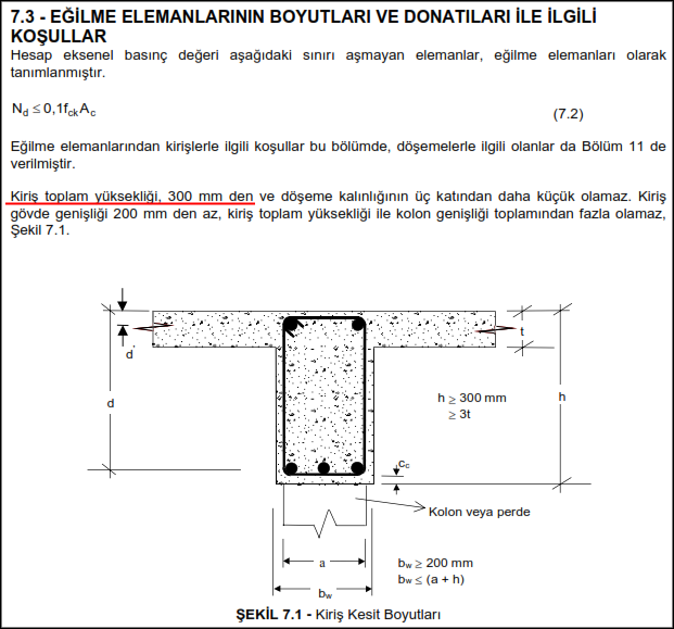 TS500’de kiriş yüksekliği için aşağıdaki koşul verilmiştir.